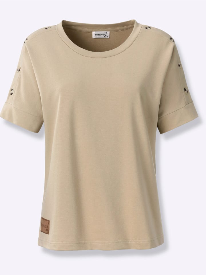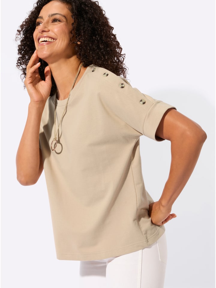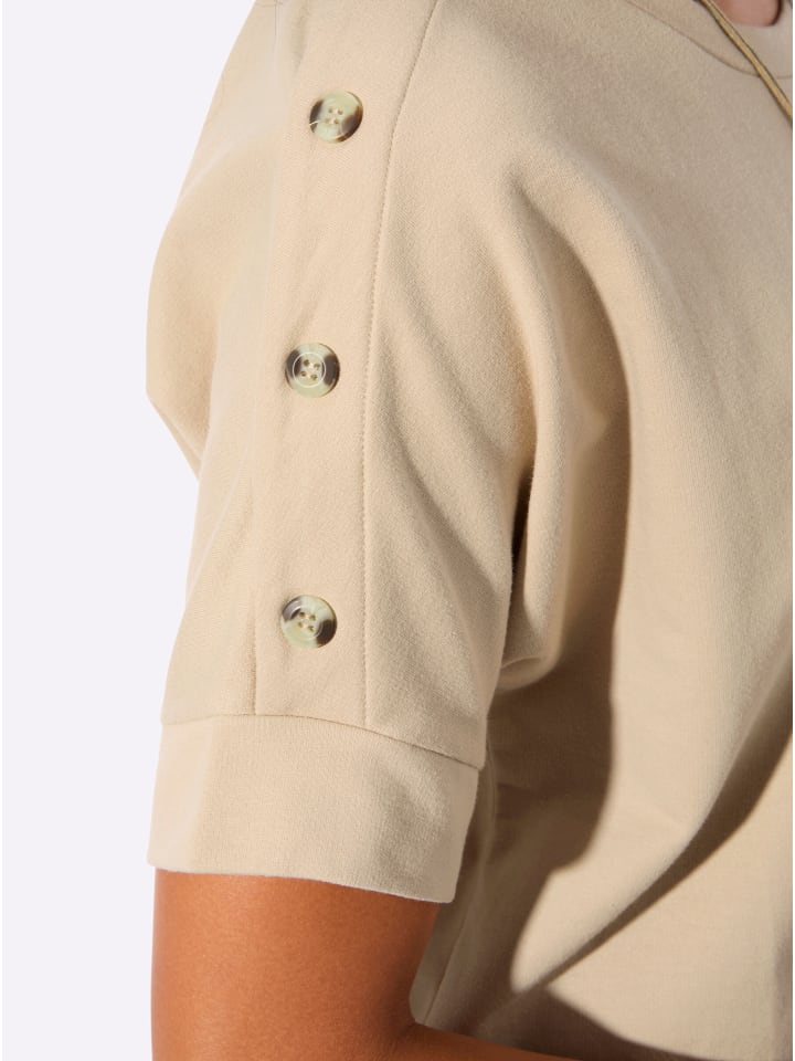 Декоративные пуговицы на плечах придают этой толстовке стильный вид! Круглый вырез горловины и слегка удлиненные короткие рукава. Изготовлена из мягкой и простой в уходе ткани. Сертифицировано OCS.