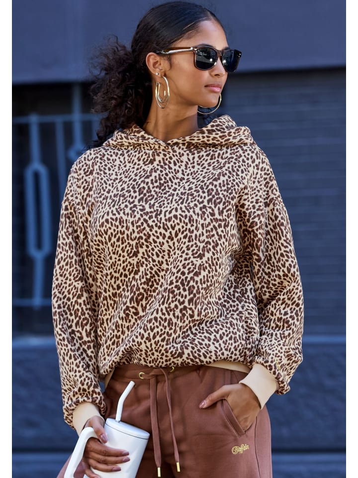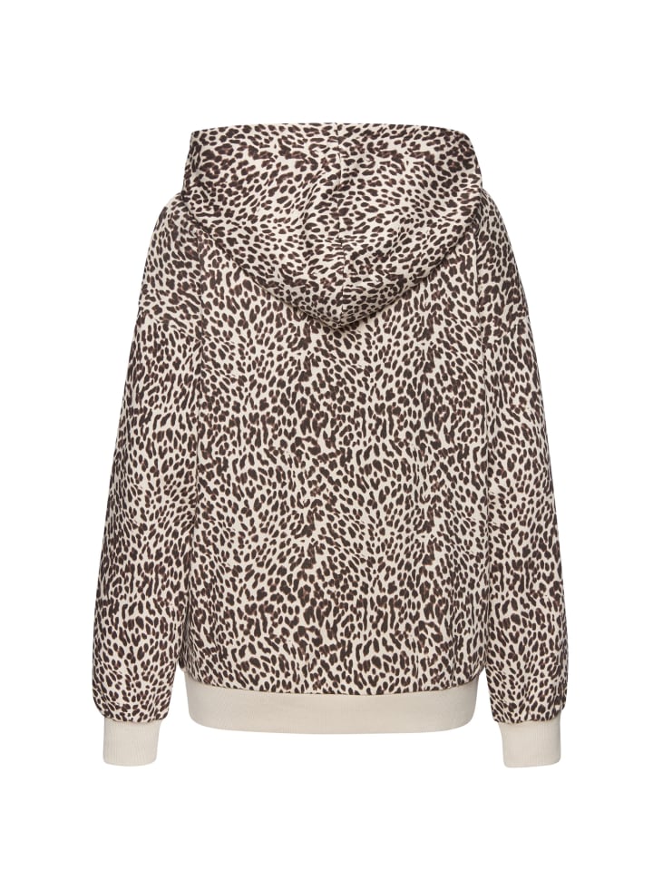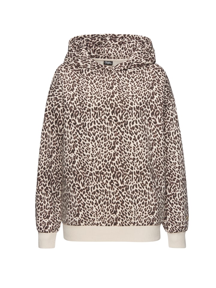Серия одежды для дома и отдыха от Buffalo. Толстовка с капюшоном с леопардовым принтом по всей поверхности, ребристые манжеты на длинных рукавах и подоле.