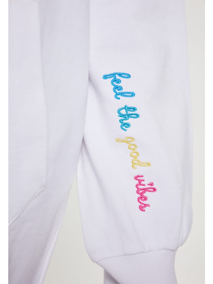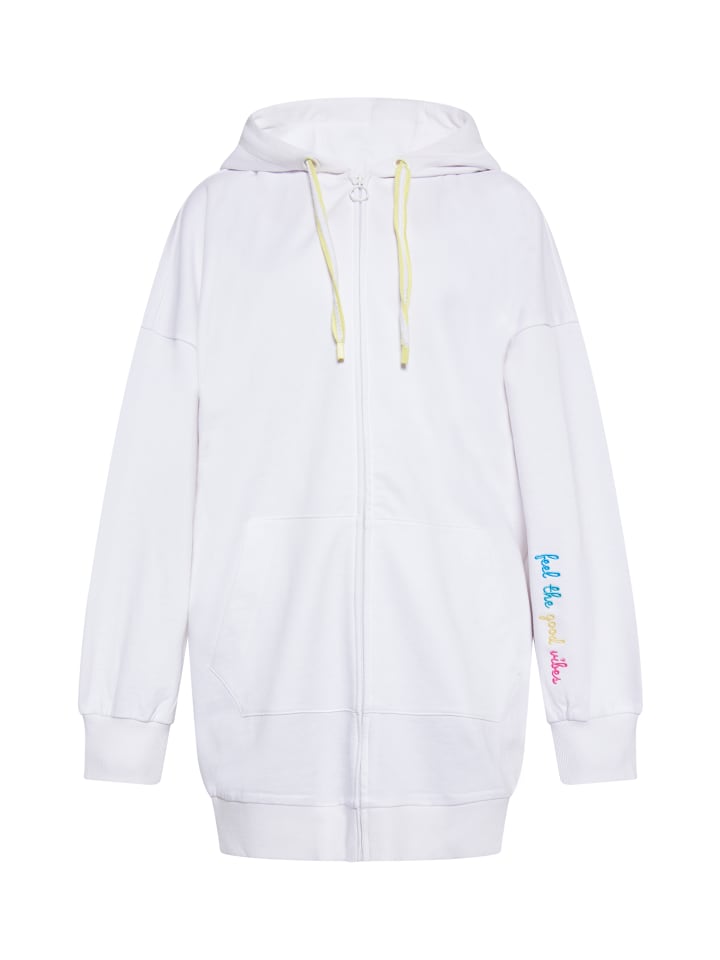 Приготовьтесь к пополнению вашего гардероба - универсальной и стильной куртке с капюшоном. Эта модель на молнии имеет прикрепленный капюшон с регулируемыми шнурками для дополнительного комфорта. Длинные рукава на резинке на запястьях обеспечивают удобную посадку. Центральный разрезной карман-кенгуру добавляет функциональности, а резинка на подоле обеспечивает идеальную посадку. Эта куртка с капюшоном, украшенная вышитой надписью «Почувствуй хорошее настроение», создает непринужденный и непринужденный образ. Изготовленная из мягкой высококачественной ткани, она идеально подходит для любого случая. Эта модель, разработанная совместно с ebeeza, сочетает в себе классический стиль и современный дизайн.