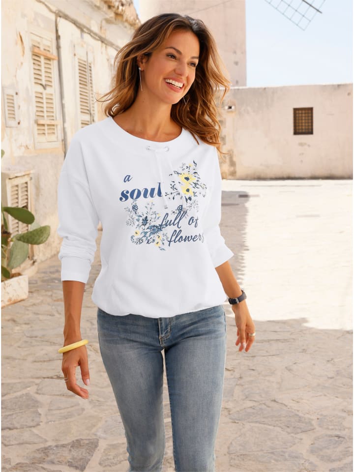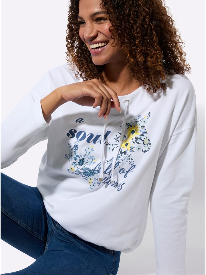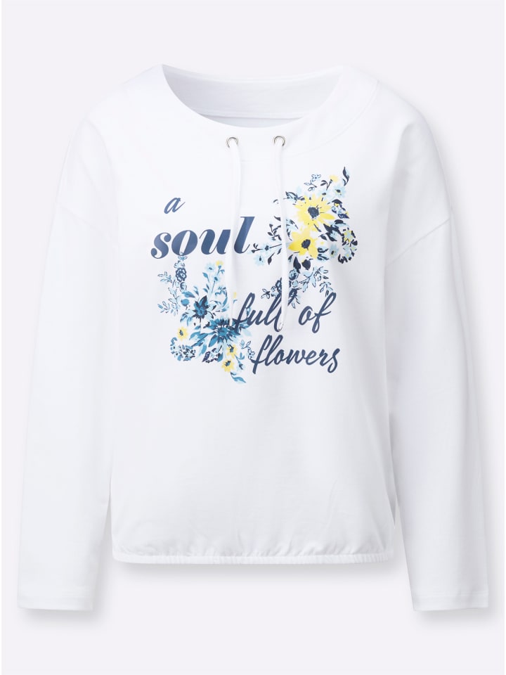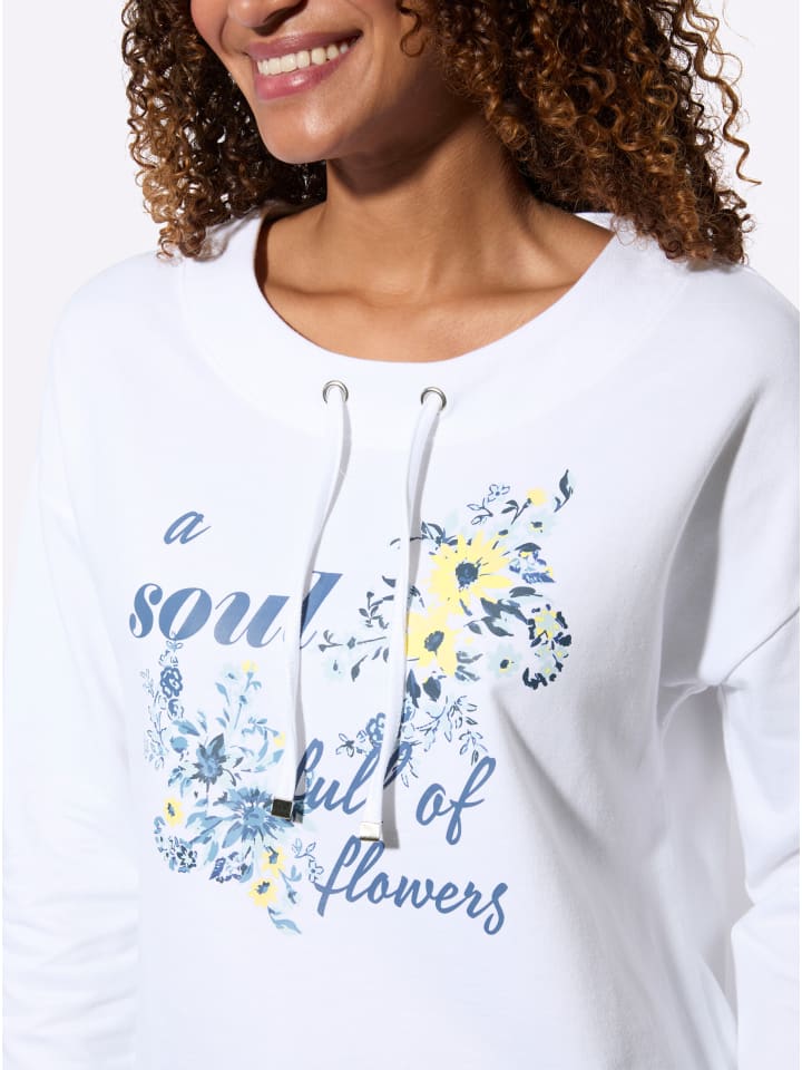 Цветочные принты занимают центральное место в этой удобной толстовке. Особенности: аппликация спереди, круглый вырез с кулиской и завязкой, а также спущенные плечи. Длинные рукава и эластичный подол завершают образ. Сертификация GOTS.