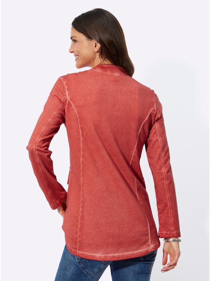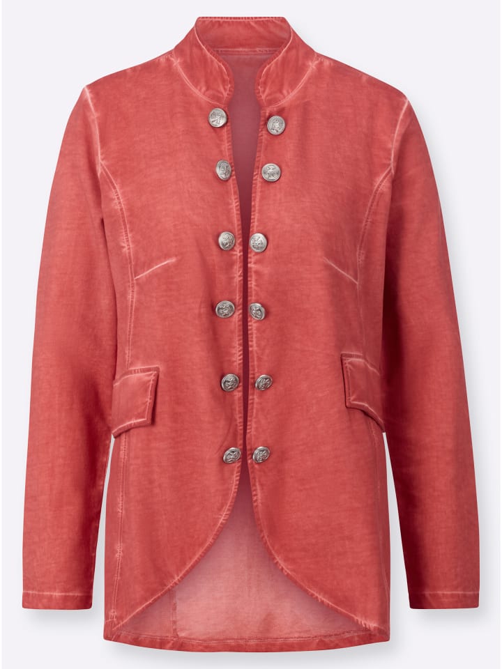 Свитшот из легкой, сохраняющей форму ткани с модным эффектом масляного окрашивания, где швы остаются более легкими. Открытый крой с воротником-стойкой и декоративными пуговицами по передним краям. Карманы с имитацией клапанов. Закругленный подол. Удлиненный сзади крой. Сертификация GOTS.