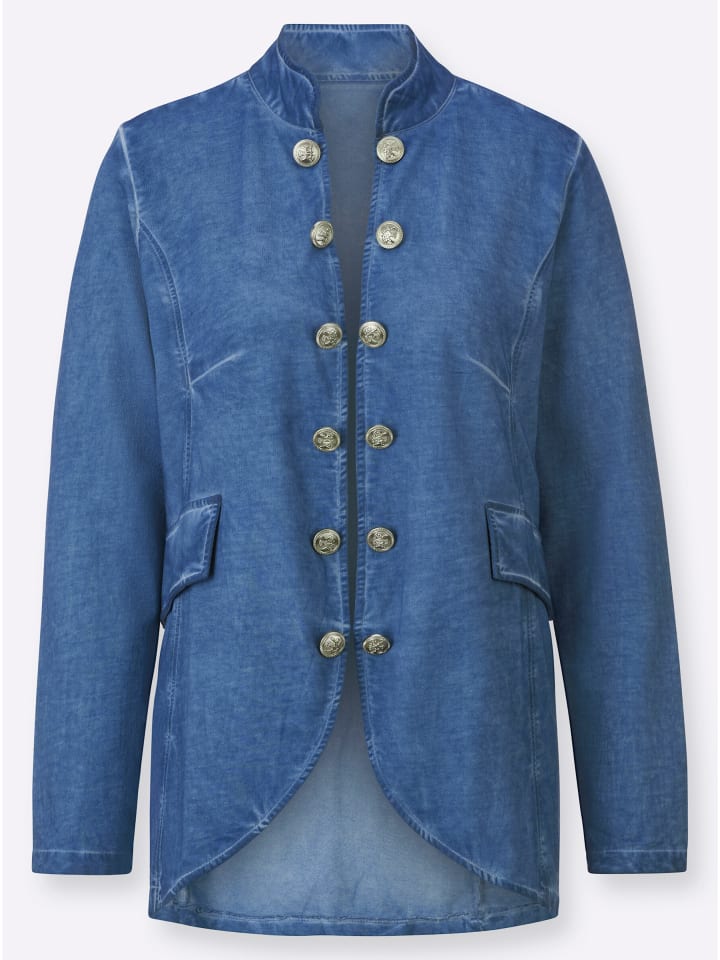 Свитшот из легкой, сохраняющей форму ткани с модным эффектом масляного окрашивания, где швы остаются более легкими. Открытый крой с воротником-стойкой и декоративными пуговицами по передним краям. Карманы с имитацией клапанов. Закругленный подол. Удлиненный сзади крой. Сертификация GOTS.