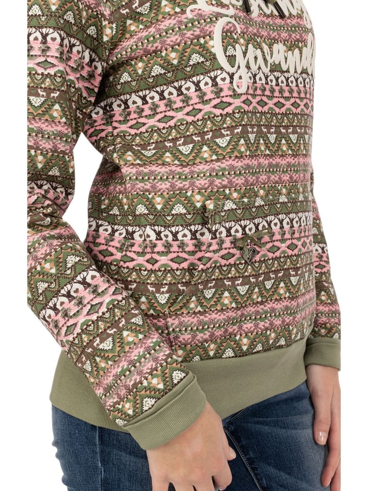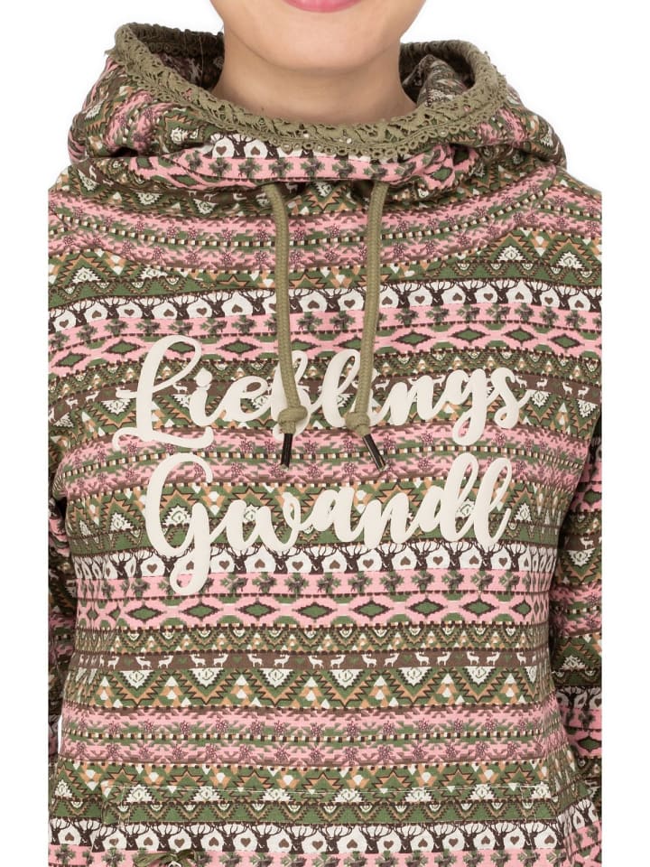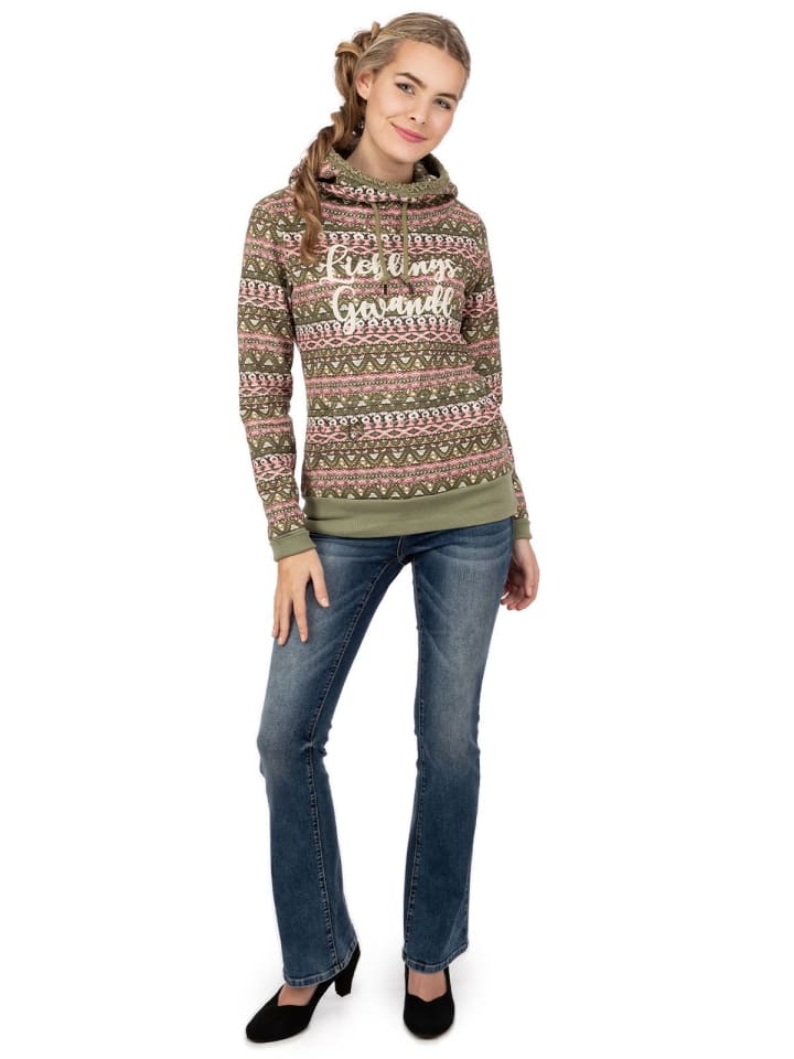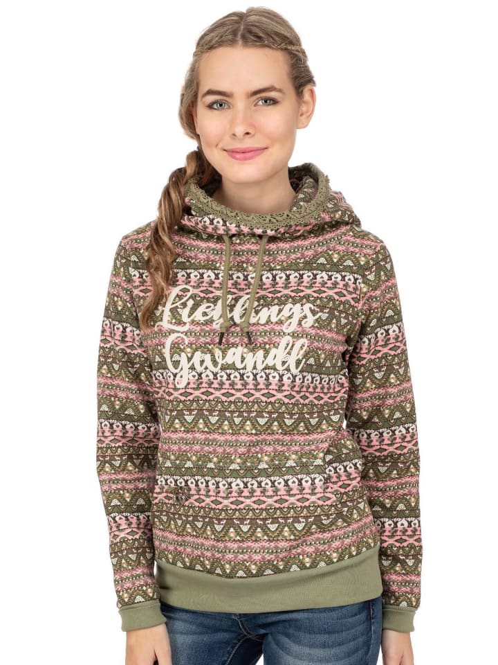 Откройте для себя неповторимое очарование худи «QUINNLEY» от Hangowear - яркого шедевра в свежем зеленом цвете, украшенного игривым розово-белым узором и напечатанным слоганом «Lieblings Gwandl» («Любимая одежда»). Эта толстовка сочетает в себе не только привлекательный дизайн, но и высочайшее качество, а также немного жизнерадостности.