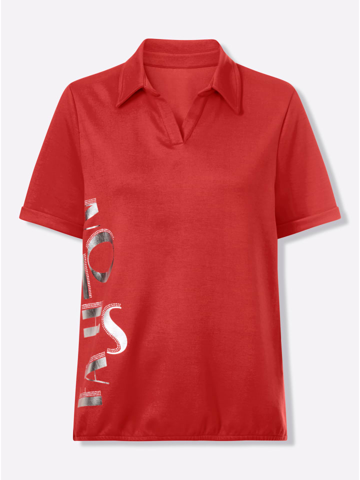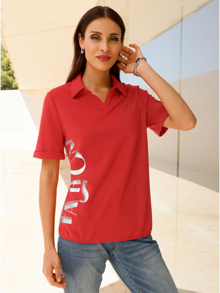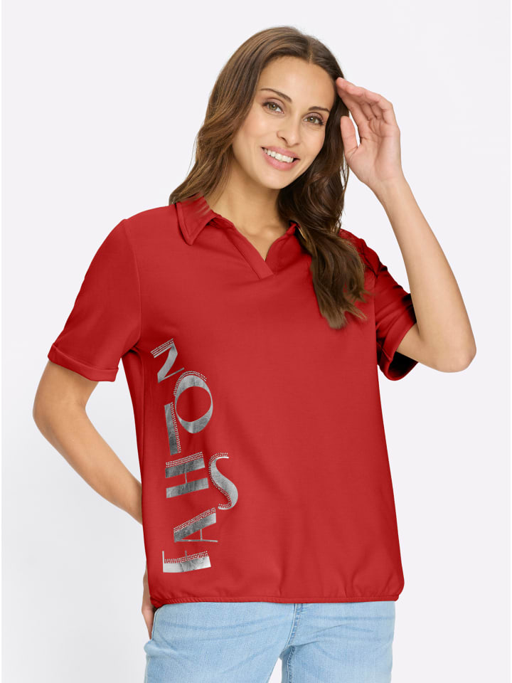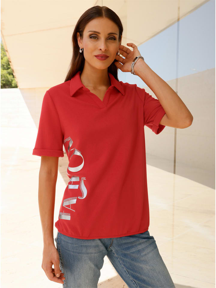 Эта спортивная толстовка, мягкая и удобная в носке, выполнена из ткани интерлок благодаря высокому содержанию модала. Она имеет открытый воротник-поло и короткие рукава с фиксированными манжетами. Подол имеет внутреннюю резинку, которая обеспечивает удобную посадку на животе и талии. Передняя часть украшена мерцающим серебристым фольгированным принтом и стразами.