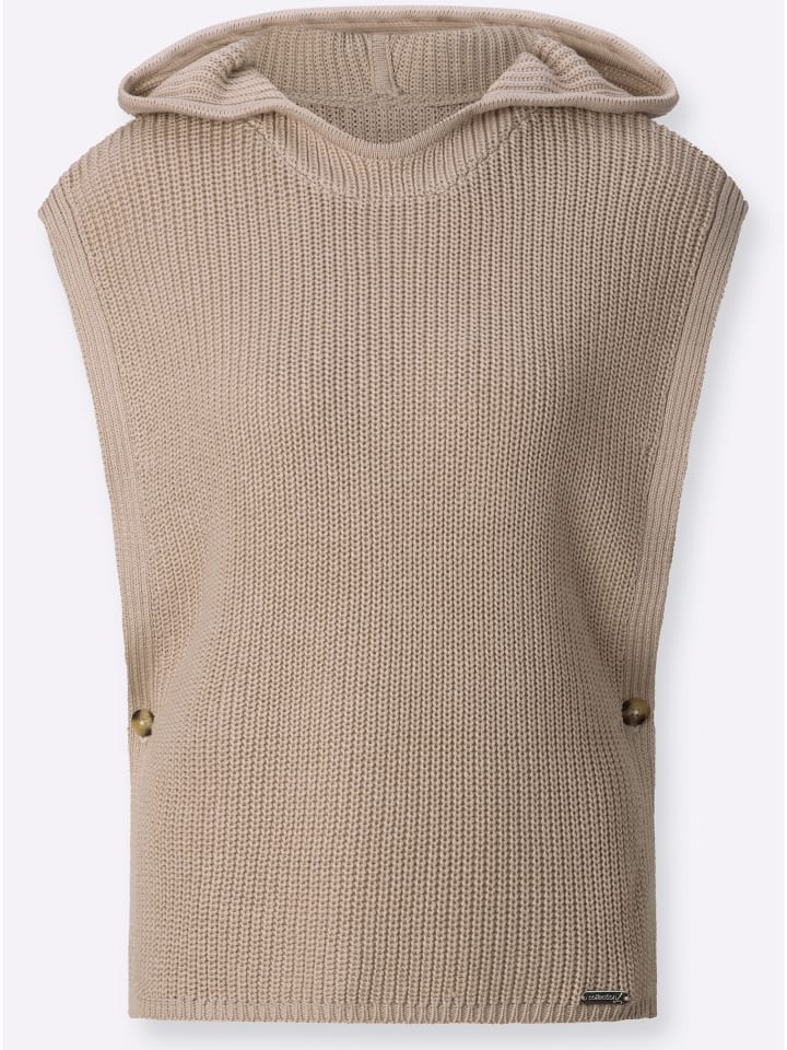 В популярном стиле пончо: этот жилет с капюшоном и непринужденно спущенными плечами - по-настоящему модный многослойный предмет одежды. Имеет боковые разрезы на пуговицах. Изготовлен из трикотажа в рубчик. Сертифицировано OCS.
