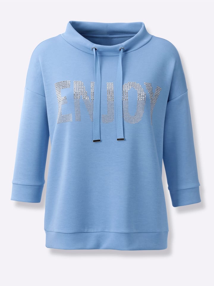 Свитшот: невероятно удобный и стильный! С надписью ENJOY и стразами. Воротник-стойка с кулиской и завязкой. Спущенное плечо и манжеты на рукавах 3/4 и по низу.
