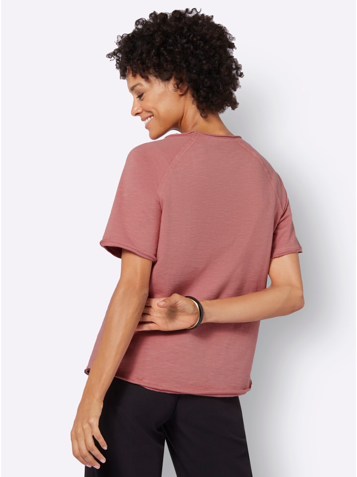 Толстовка с подвернутыми манжетами и декоративной строчкой на круглом вырезе горловины, а также короткими рукавами реглан. Слегка закругленный подол. Модные необработанные края. Поддерживает инициативу «Хлопок, сделанный в Африке».