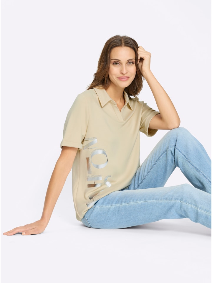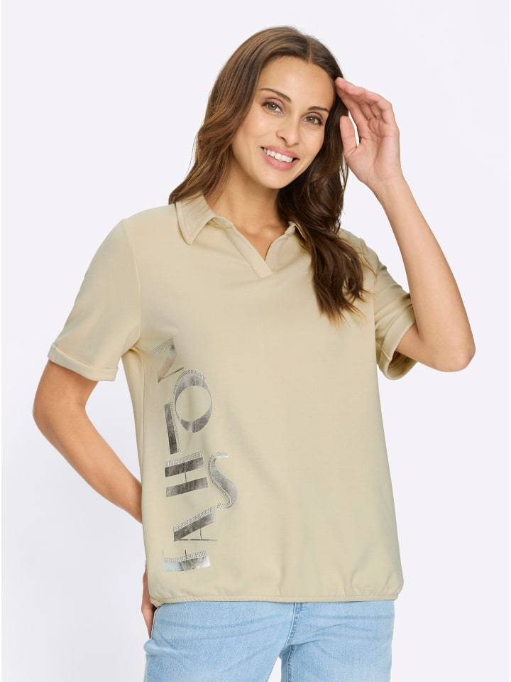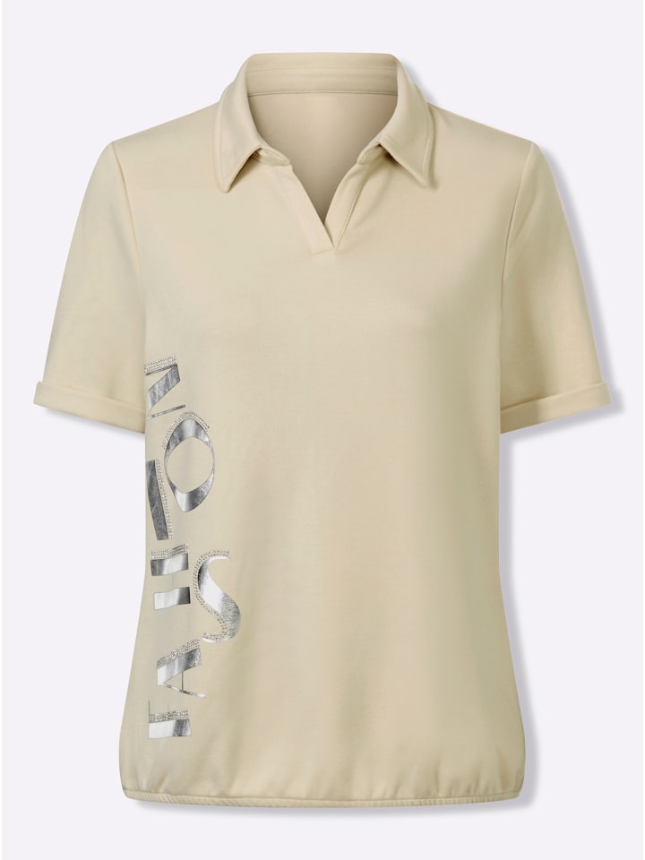 Эта спортивная толстовка, мягкая и удобная в носке, выполнена из ткани интерлок благодаря высокому содержанию модала. Она имеет открытый воротник-поло и короткие рукава с фиксированными манжетами. Подол имеет внутреннюю резинку, которая обеспечивает удобную посадку на животе и талии. Передняя часть украшена мерцающим серебристым фольгированным принтом и стразами.