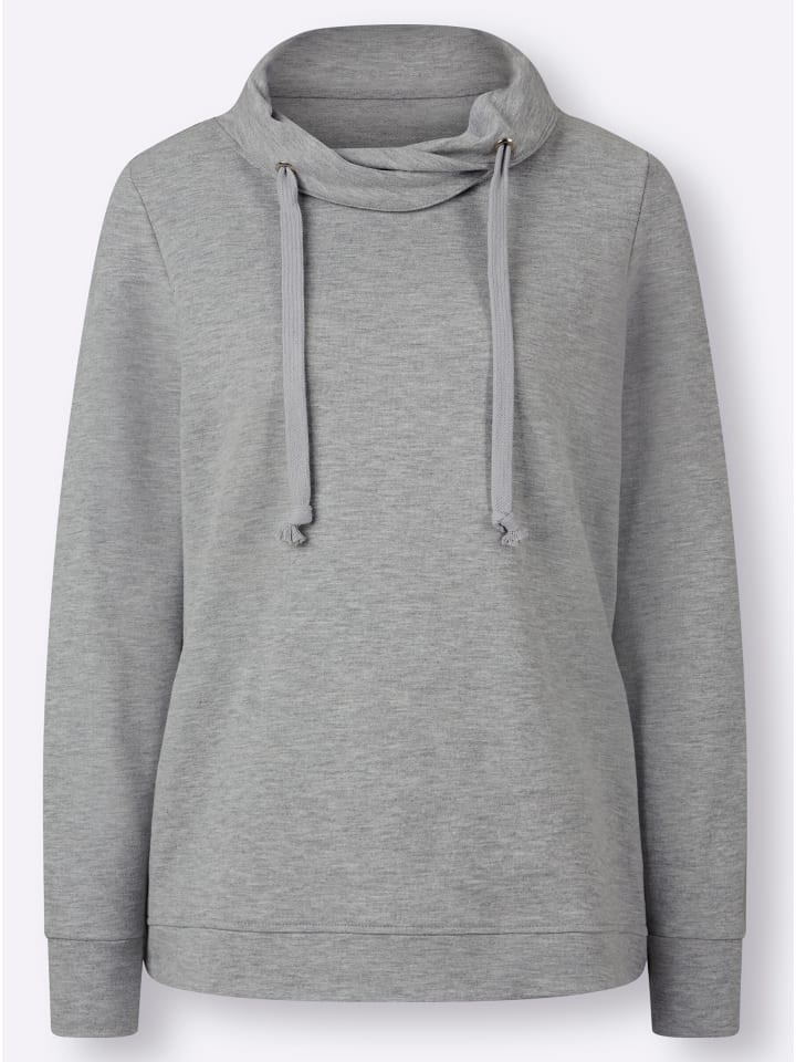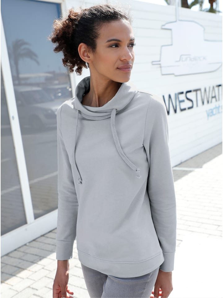 Уютная толстовка с асимметричным, свободным воротником-стойкой, украшенным люверсами и затягивающимся шнурком. Высокие манжеты, слегка закругленный подол.