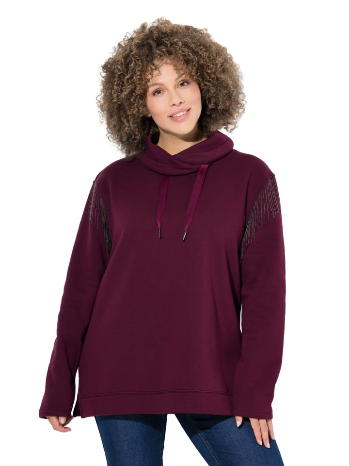 Толстовка классического кроя из гладкой трикотажной ткани с мягким начесом на изнанке. Высокий широкий воротник-стойка с завязкой. Спущенные плечи с модной цепочной бахромой, длинные рукава. Низ с боковыми разрезами для дополнительного комфорта.