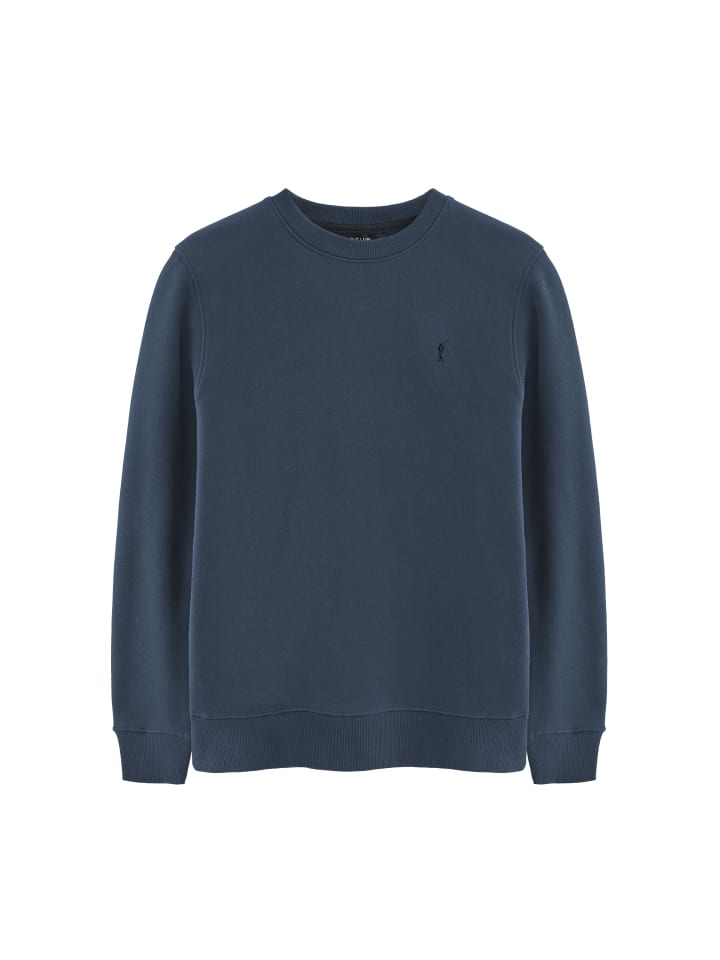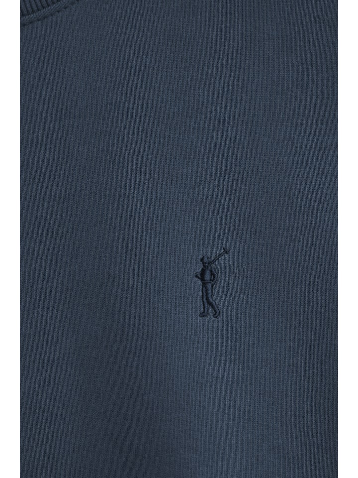 Мужская толстовка свободного кроя с круглым вырезом, с характерным эффектом потертости благодаря окрашенной в готовом виде ткани. Мягкий хлопковый материал делает ее удобной и универсальной одеждой для повседневного ношения.
