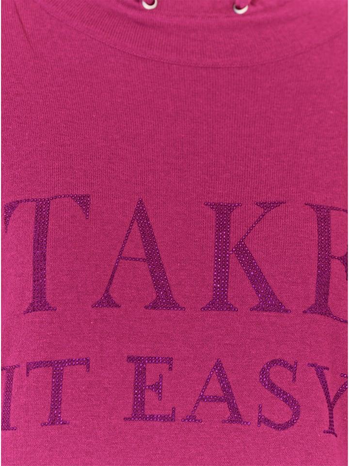 Свитер из легкого тонкого трикотажа с добавлением кашемира. Эффектная надпись «TAKE IT EASY» из стразов. Воротник-стойка затягивается на модный шнурок. Ребристые манжеты на рукавах и подоле.