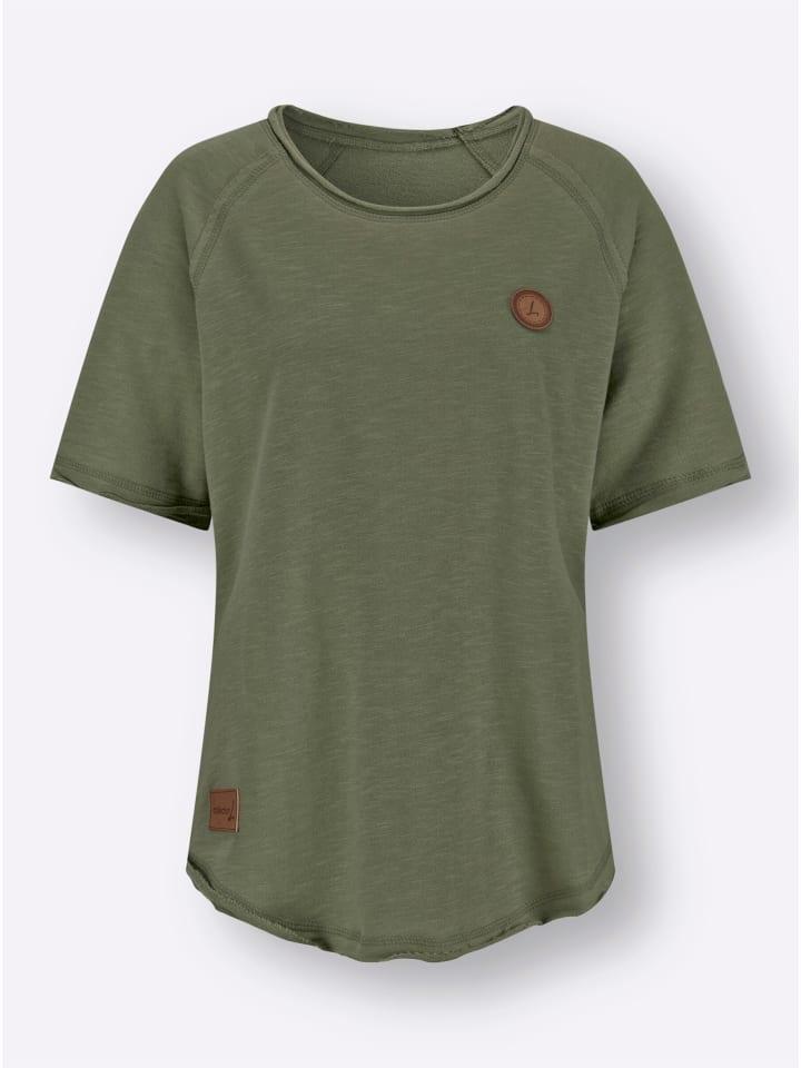 Толстовка с подвернутыми манжетами и декоративной строчкой на круглом вырезе горловины, а также короткими рукавами реглан. Слегка закругленный подол. Модные необработанные края. Поддерживает инициативу «Хлопок, сделанный в Африке».