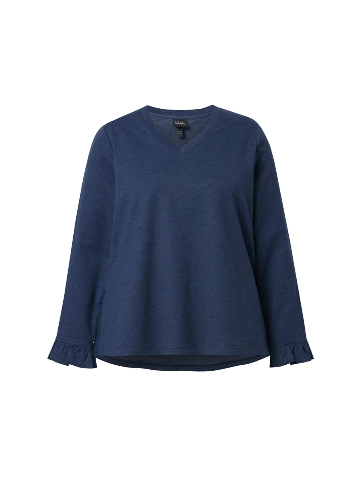 Толстовка А-силуэта из мягкой меланжевой трикотажной ткани с V-образным вырезом. Особенности: длинные боковые разрезы, длинные рукава с узкой оборкой. Низ сзади длиннее примерно на 8 см.