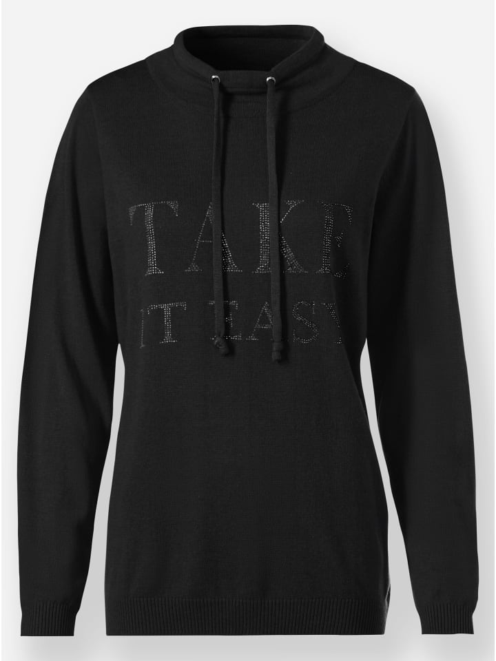 Свитер из легкого тонкого трикотажа с добавлением кашемира. Эффектная надпись «TAKE IT EASY» из стразов. Воротник-стойка затягивается на модный шнурок. Ребристые манжеты на рукавах и подоле.
