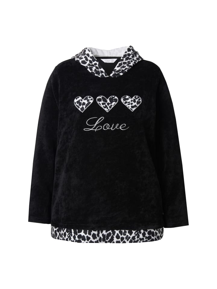 Толстовка с капюшоном, удобного кроя, из очень мягкого флиса с леопардовым принтом на капюшоне и подоле. Три сердца с надписью, длинные рукава.