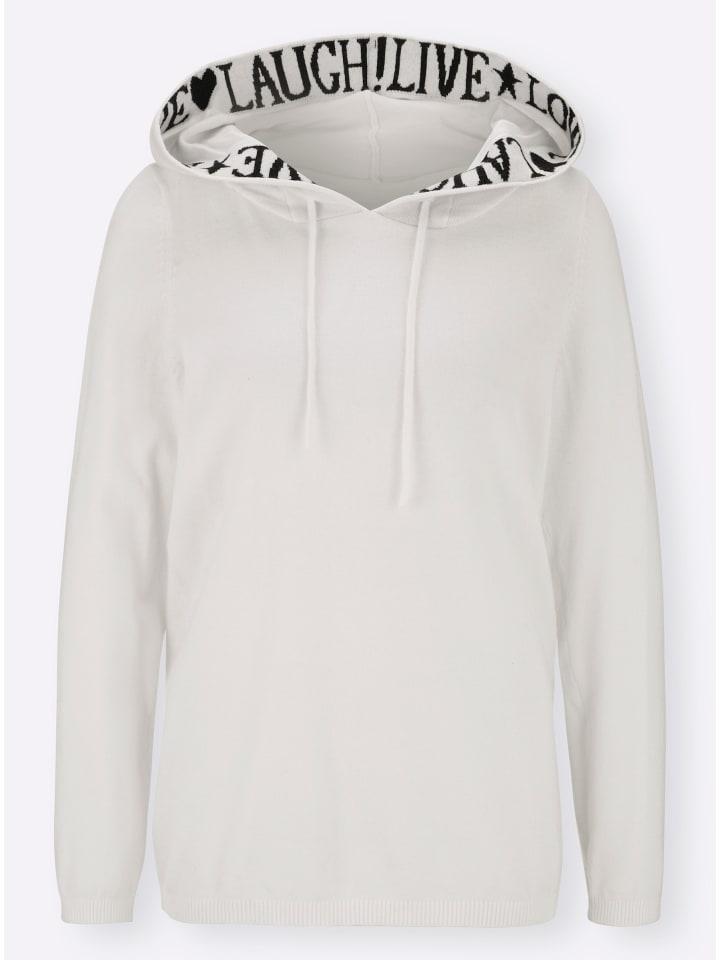 Свитер со стильным слоганом «ЖИВИ, ЛЮБИ, СМЕЙСЯ!», рисунком в виде сердца и звезды, а также капюшоном на шнурке. Прямой крой с длинными рукавами и ребристыми манжетами. Мягкий, высококачественный тонкий трикотаж.