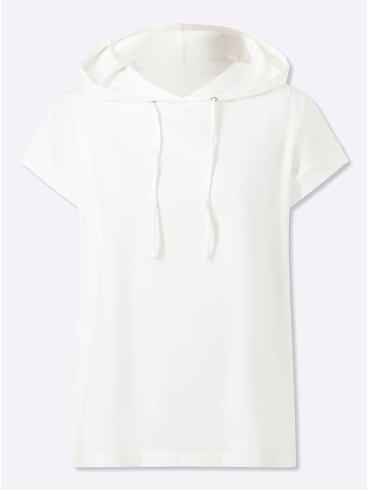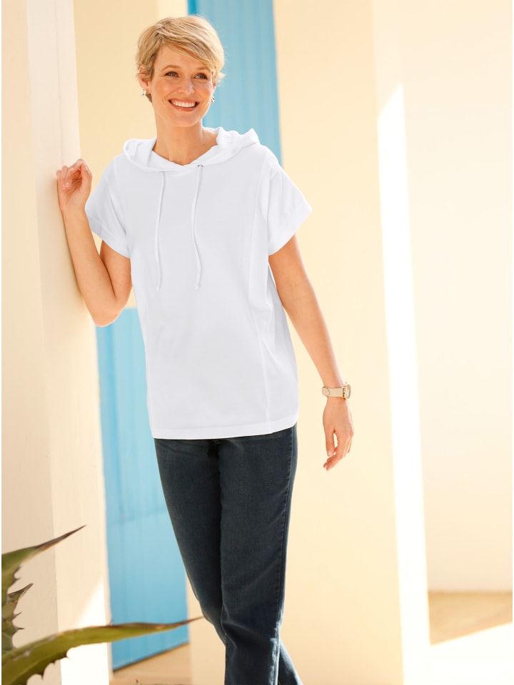 Рубашка с капюшоном из комфортного хлопка, завязывается на шнурке и завязывается на воротнике капюшона. Спущенное плечо с обтачкой и косые швы спереди и сзади подчеркивают спортивный стиль.