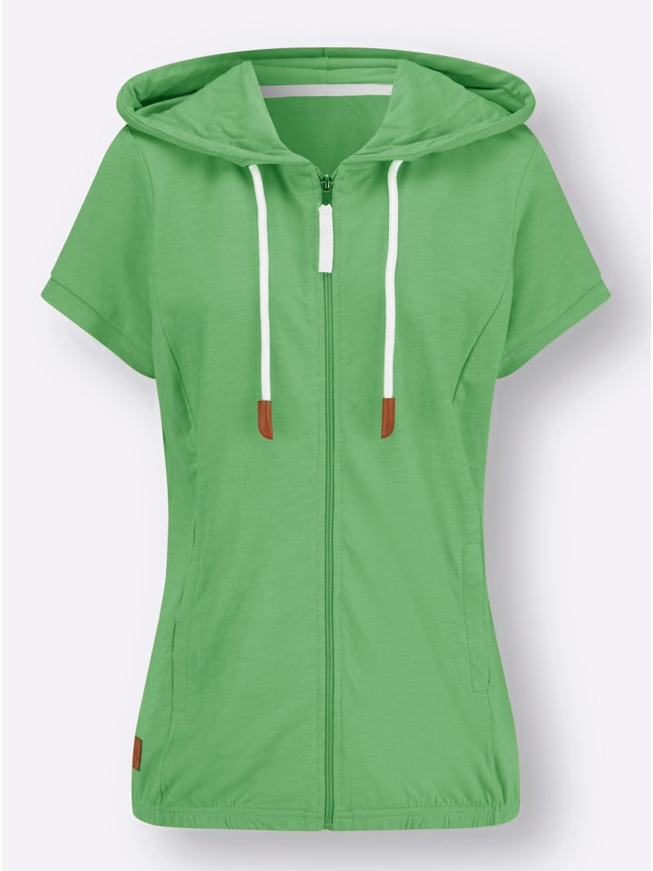 Будьте в тренде: толстовка с капюшоном, кулиской и завязкой. Формирующие швы. Застежка-молния и практичные карманы в швах. Короткие рукава. Эластичный подол для идеальной посадки. Соответствует инициативе «Хлопок, сделанный в Африке».