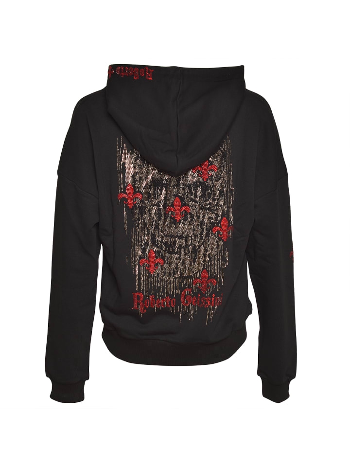 Капюшон также является изюминкой, украшенной надписью «Roberto Geissini» из красных стразов для дополнительного гламура.