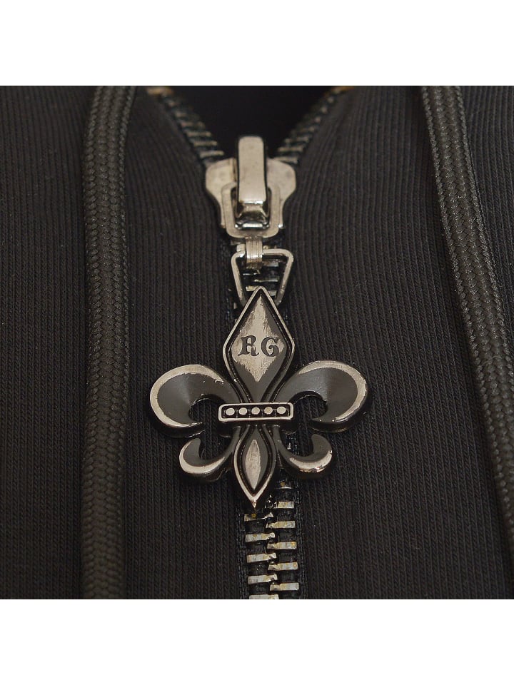 Многочисленные мотивы геральдических лилий с красными стразами стильно добавляют цвета рисунку черепа. Правый рукав продолжает стиль