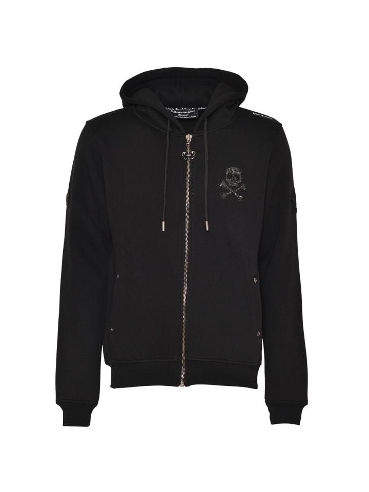 Оставайтесь в тепле и прохладе с нашей роскошной мужской толстовкой с принтом большого черепа, костей и геральдической лилии, усыпанной стразами, на спине.