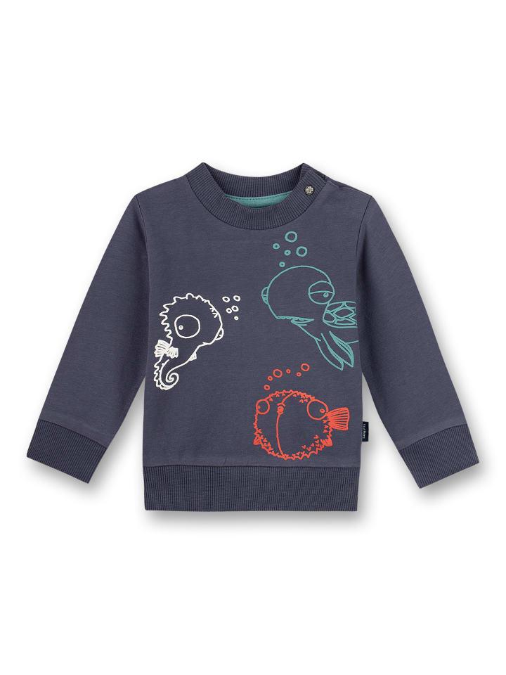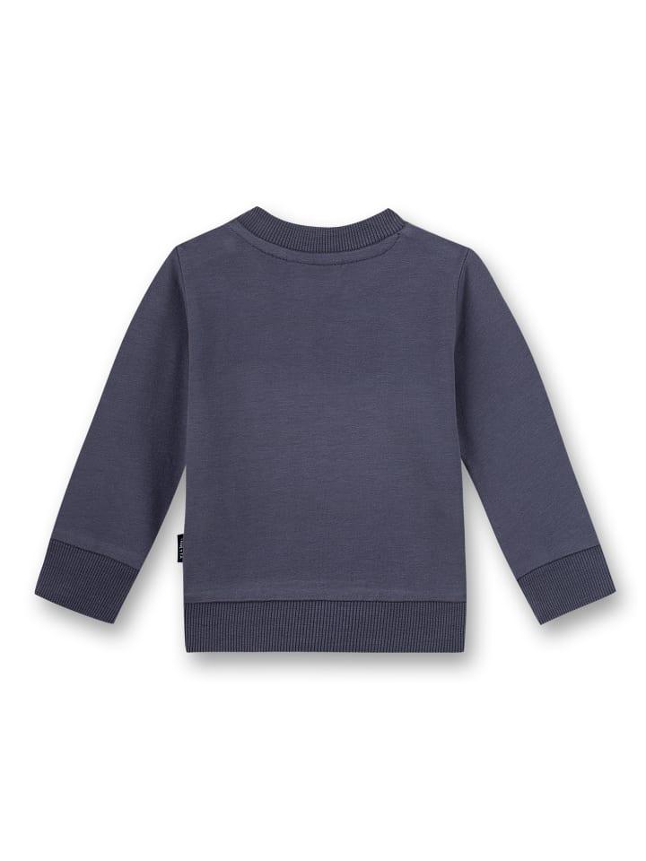 Толстовка для мальчика темно-синего цвета с забавным рисунком от Sanetta Kidswear. - Удобная и мягкая ткань толстовки из эластичной смеси органического хлопка. - Спортивные ребристые манжеты идеально облегают фигуру. - Кнопки на плечах облегчают надевание. - С мягкой резинкой на горловине.
