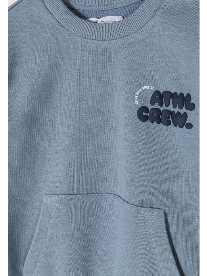 Мягкая хлопковая толстовка. Карман-кенгуру, круглый вырез горловины, ребристые манжеты. Декоративный принт спереди.