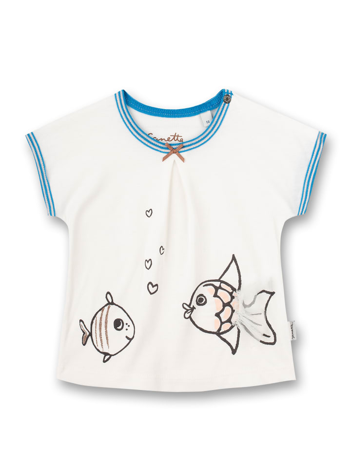 Очаровательная футболка нежно-белого цвета для девочек с игривым рисунком каракулей в виде рыбок от Sanetta Kidswear.