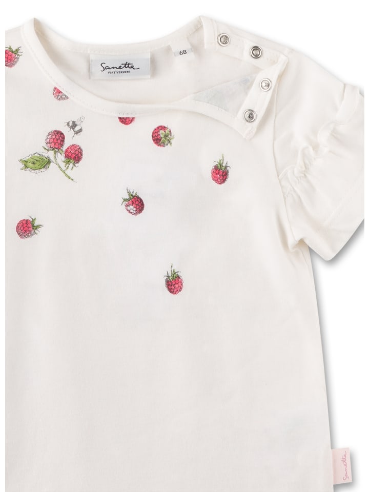 Милая футболка для девочек от Sanetta Fiftyseven в красивом бежевом цвете с летними малиновыми мотивами на груди.