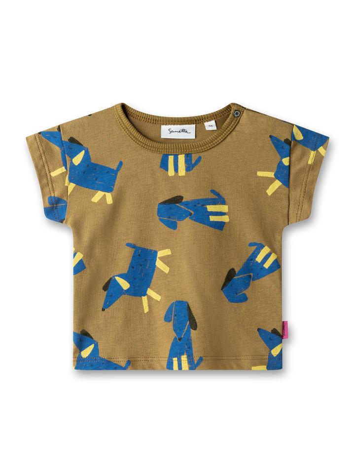 - Забавный принт собаки по всей поверхности в сине-желтых тонах на теплом оливковом фоне делает эту футболку по-настоящему привлекательной.