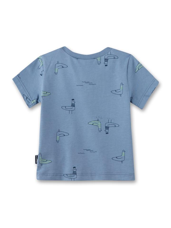 Футболка для мальчика синего цвета с небольшой планкой на пуговицах и милым принтом маленьких чаек по всей поверхности.