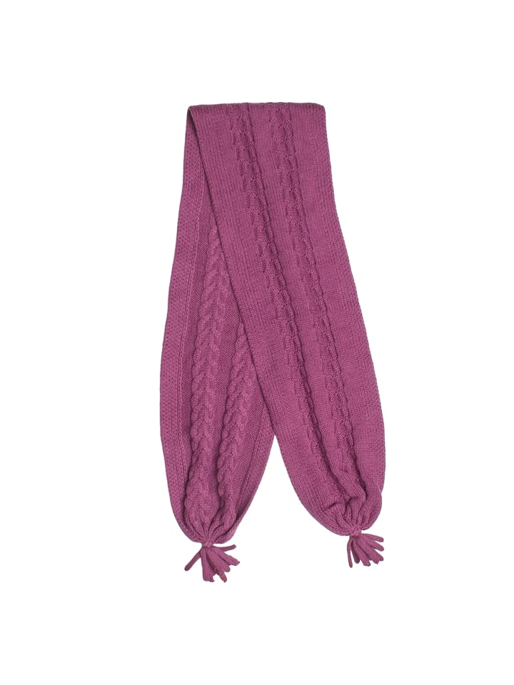 Шарф прямоугольной формы с узором из вертикальных кос по центру, окаймленный гладкими трикотажными полосками по бокам. В качестве декоративной и функциональной детали концы отделаны кисточками из того же материала, надежно завязанными узлами для предотвращения осыпания.