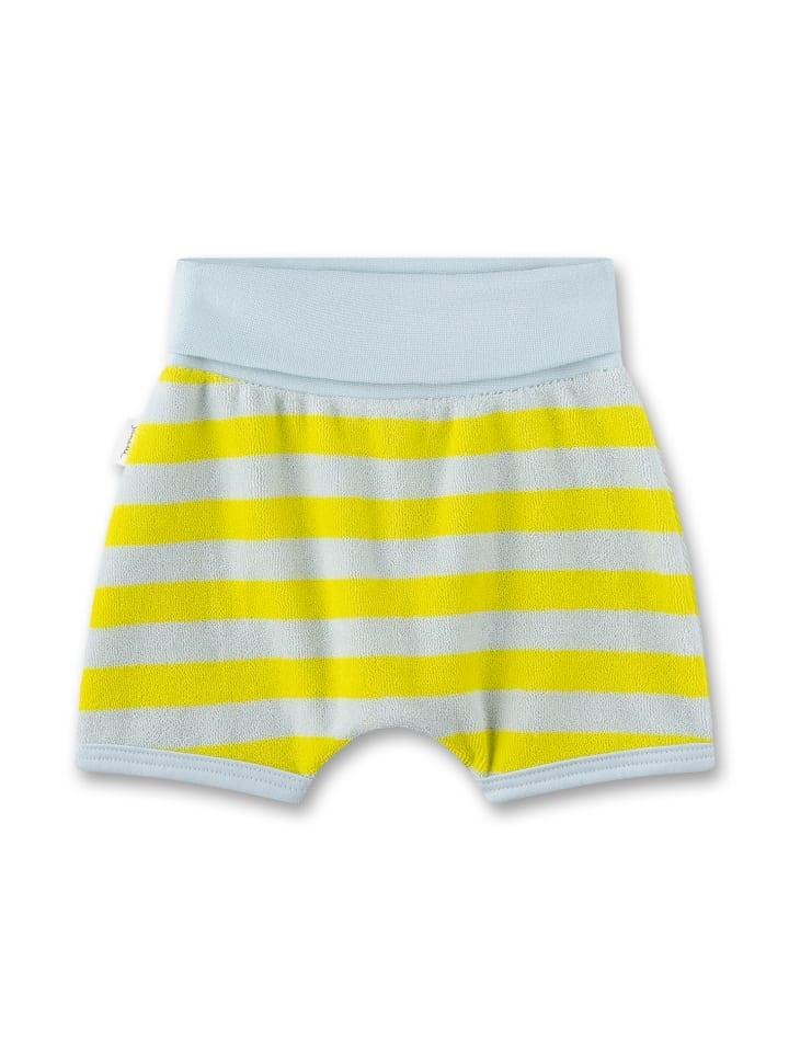 Игривые махровые шорты для девочек с желтым полосатым рисунком и изображением морского конька для малышей от Sanetta Pure.