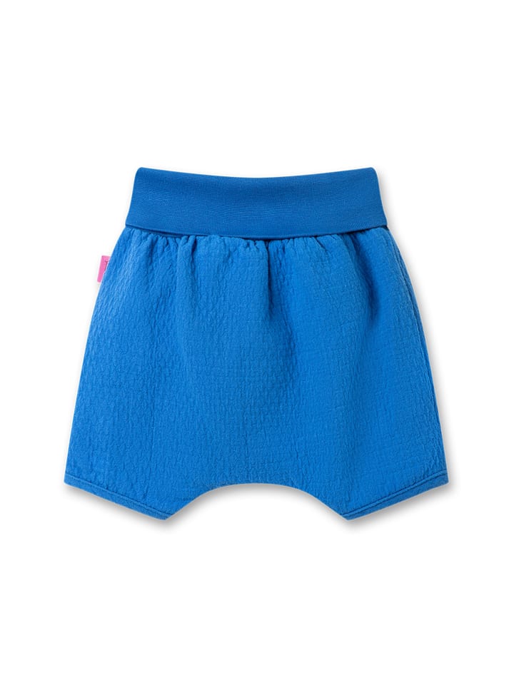 Очаровательные летние шорты для младенцев и малышей синего цвета с декоративной пуговицей и розовой этикеткой от Sanetta Pure.