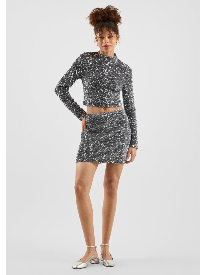 Этот гламурный топ с пайетками из коллекции QS x Vanessa Mai добавит блеска вашему образу. Слегка эластичный бархат с серебристым металлическим покрытием и воротником-стойкой не оставит равнодушным никого. Приталенный крой и укороченная длина делают этот топ с длинными рукавами идеальным дополнением к вашим любимым джинсам - будь то выход в свет или встреча с друзьями.