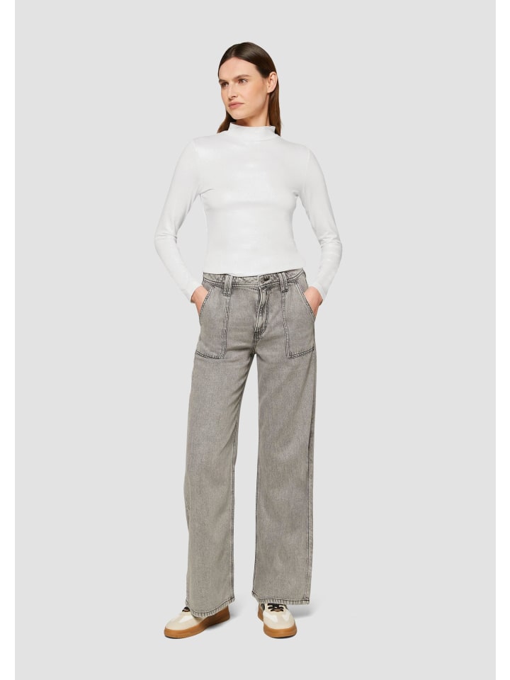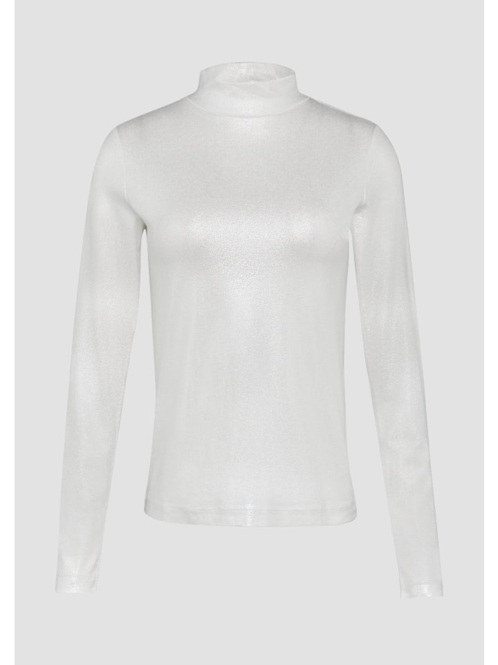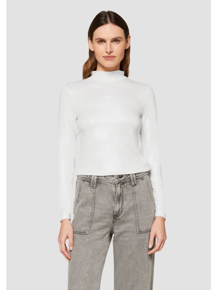 Эта женственная рубашка с длинными рукавами и воротником-стойкой впечатляет своим облегающим кроем и эластичной вискозной смесью. Высококачественный тисненый рисунок на однотонном трикотаже сделает ее стильным спутником на каждый день.