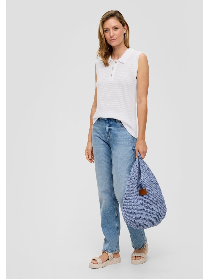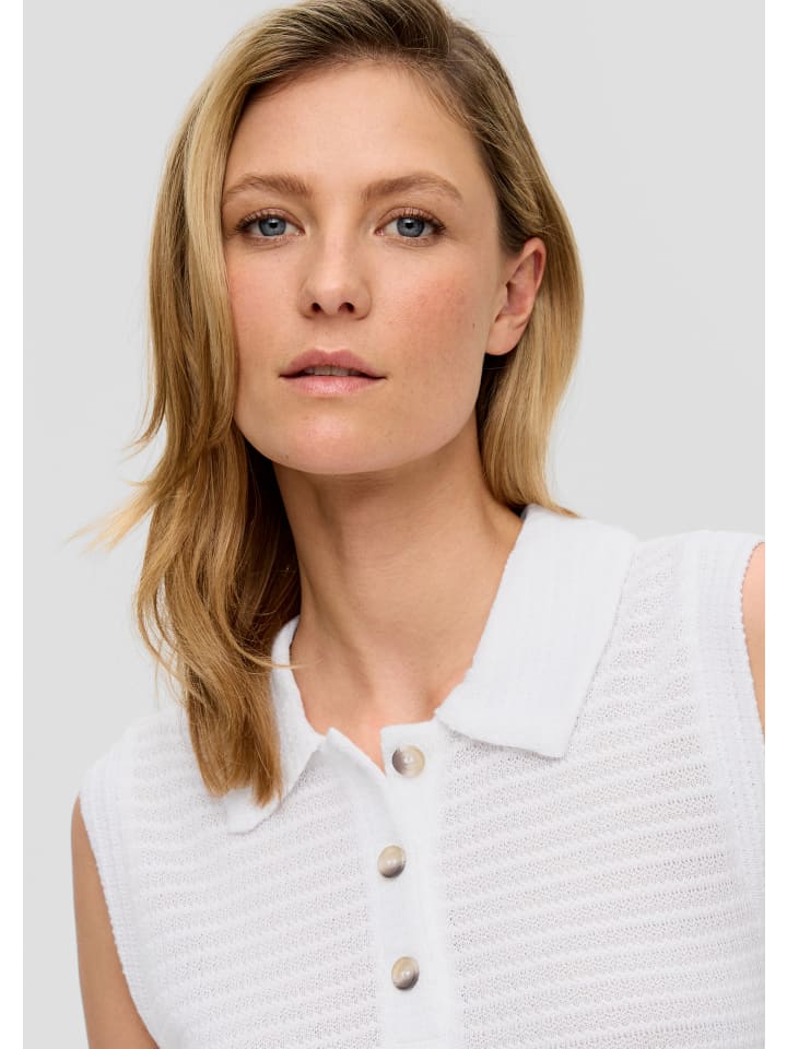 Откройте для себя этот универсальный фактурный топ с воротником из мягкой смеси хлопка и модала. Эта женская футболка с короткими рукавами имеет свободный крой и идеально сочетается с джинсами или шортами. Приобретите эту модную базовую модель для своего летнего гардероба прямо сейчас и носите ее так, как вам нравится.
