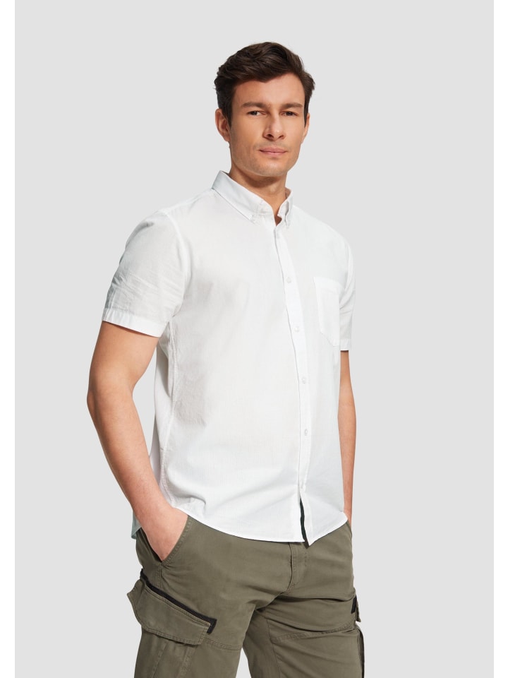 Легкая, воздушная рубашка с короткими рукавами, тонкой фактурной полоской и классическим воротником на пуговицах. Прямой крой и закругленный низ обеспечивают непринужденный комфорт. Нагрудный карман идеально дополняет лаконичный, повседневный современный образ.