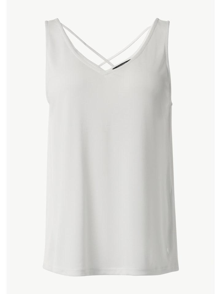 Непринужденное обновление вашего летнего гардероба: эта рубашка без рукавов с V-образным вырезом выполнена из легкого трикотажа. Перекрещивающиеся бретели и свободный прямой крой придают ей нотку непринужденного шика. Сочетайте ее с шортами или джинсами для непринужденного городского образа или надевайте под куртку для прохладных вечеров.