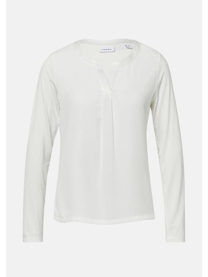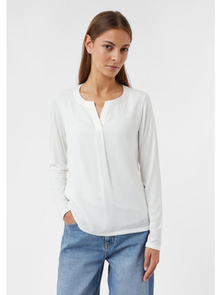 Эта рубашка-блузка добавит движения в вашу повседневную жизнь - и стильно. Струящийся перед из вискозы подчеркивает фигуру, а мягкий трикотажный материал сзади обеспечивает комфорт. Туникообразный вырез горловины придает образу непринужденный вид, а тонкие складки добавляют модные акценты. Эта рубашка с длинными рукавами подойдет для любого случая: от джинсов для повседневного образа до классических брюк для офиса. Универсальная вещь, которую можно носить как с нарядным, так и с повседневным вариантом.