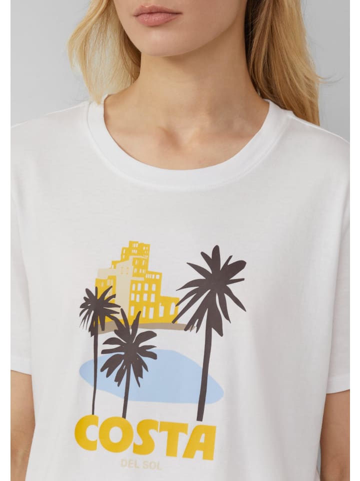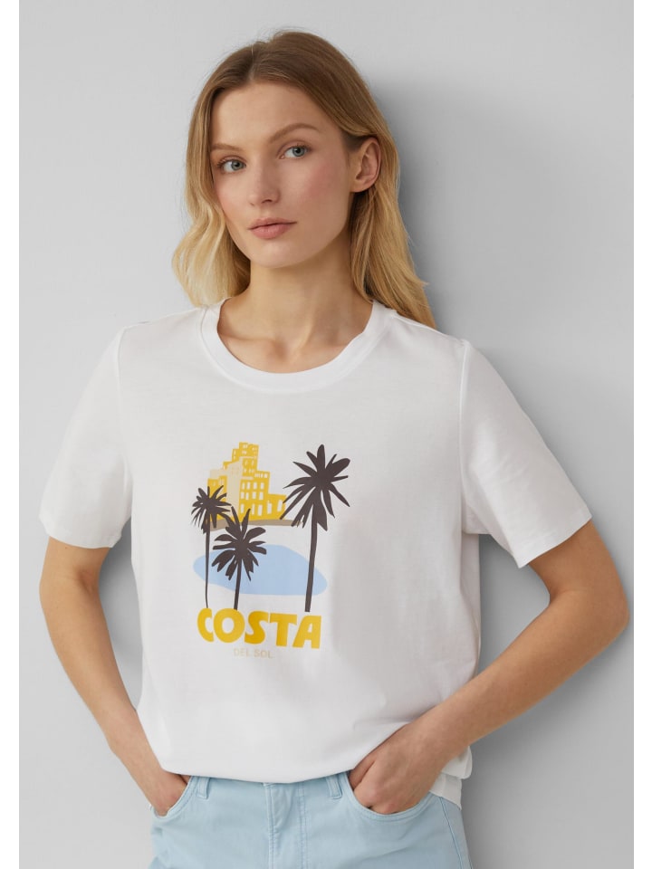 Ищете отпускное настроение? Эта повседневная футболка с крутым принтом спереди подарит вам летнее настроение! Свободный крой из мягкого хлопкового джерси обеспечит вам абсолютный комфорт как в городе, так и на пляже. Сочетайте ее с джинсами или юбкой. Ваш новый фаворит для расслабленных дней и особых моментов!