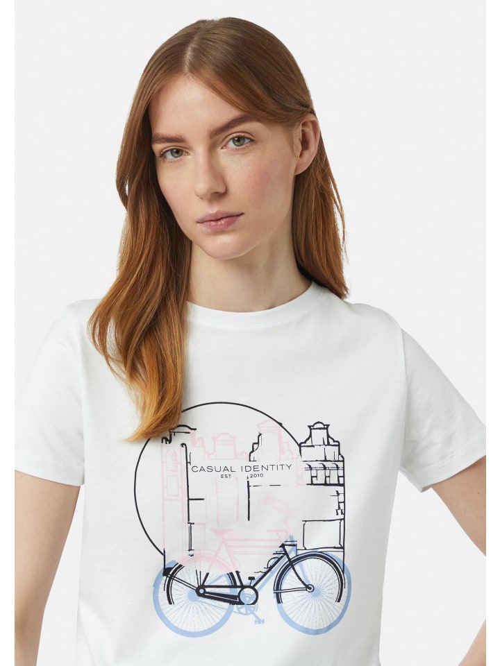 Повседневный стиль с характером: эта футболка сочетает в себе комфорт и стиль. Классический крой из мягкого хлопкового джерси подчеркивает фигуру, а круглый вырез горловины добавляет классический штрих. Изюминка: эффектный принт спереди, который придаст вашему образу индивидуальность. Идеально подходит для расслабленных дней или неформальных вечеров - универсальная и всегда привлекающая внимание.