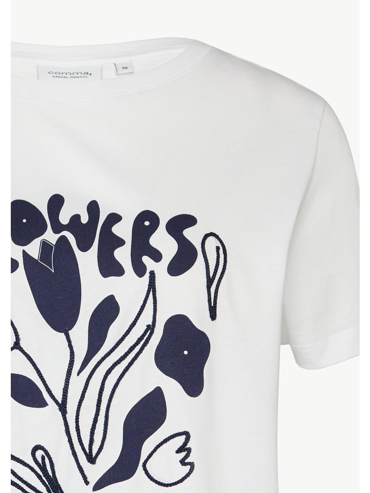 Повседневный стиль с характером: эта футболка сочетает в себе комфорт и стиль. Классический крой из мягкого хлопкового джерси подчеркивает фигуру, а круглый вырез горловины добавляет классический штрих. Изюминка: эффектный принт спереди, который придаст вашему образу индивидуальность. Идеально подходит для расслабленных дней или неформальных вечеров - универсальная и всегда привлекающая внимание.