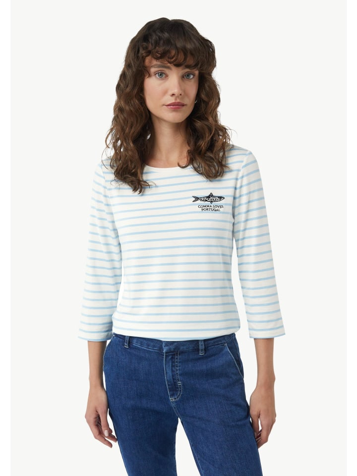 Морской шик и женственные детали: эта полосатая рубашка из вискозного джерси сочетает в себе комфорт и стиль. Круглый вырез горловины и рукава ¾ создают привлекательный силуэт, а трикотажные полоски и изящная вышивка добавляют изысканности. Эта рубашка облегающего кроя идеально подходит для повседневных случаев и легко сочетается с различными образами.