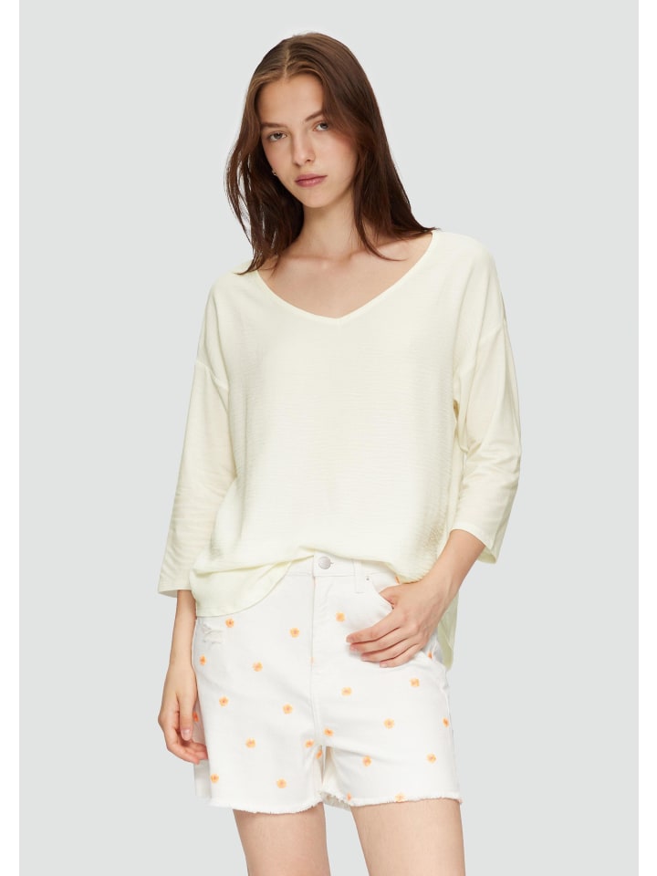 Ваш стильный универсал: эта рубашка с рукавами 3/4 выполнена из смеси шелковистого джерси и мягкой ткани. V-образный вырез и спущенные плечи создают непринужденный образ. Свободный крой идеально подходит для расслабленных дней!