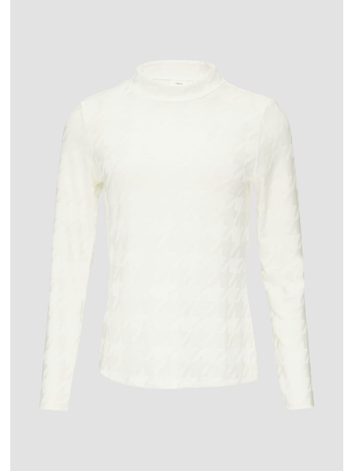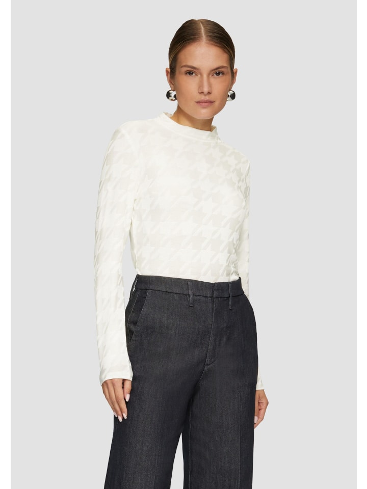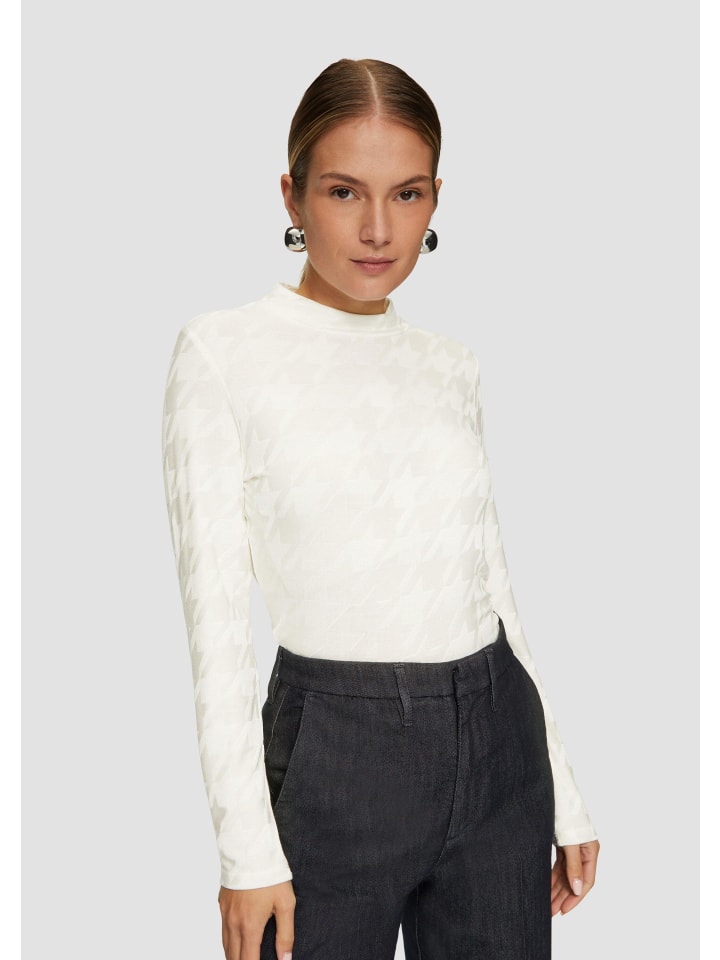 Стильная футболка с длинными рукавами и модным узором «гусиная лапка» - идеальный вариант для повседневного образа! Высокий вырез горловины с воротником-стойкой добавит элегантности. Благодаря облегающему крою и мягкому вискозному трикотажу футболка приятна к телу. Сочетайте ее с джинсами для создания непринужденного повседневного образа или с юбкой для создания элегантного офисного образа.