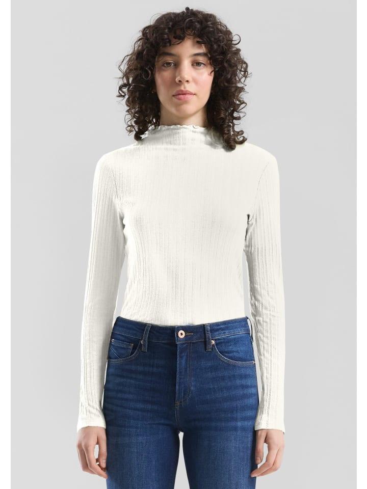 Ваш новый стильный спутник: эта приталенная рубашка с длинными рукавами и нежным ажурным узором впечатляет мягкой ребристой тканью и эластичным комфортом. Элегантный воротник-стойка и приталенный крой идеально подчеркнут вашу фигуру.
