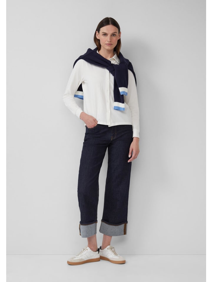 Эта удобная трикотажная блузка свободного прямого кроя впечатляет классическим рубашечным воротником и практичной планкой на пуговицах. Мягкий эластичный материал с закругленным подолом делает ее идеальным повседневным дополнением к любому образу в стиле casual.