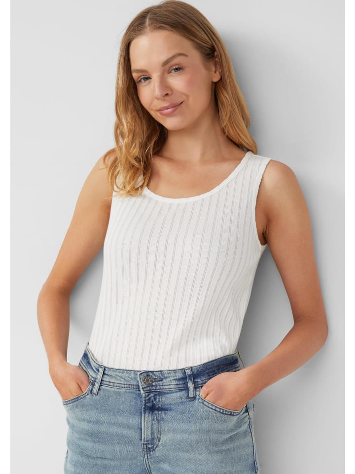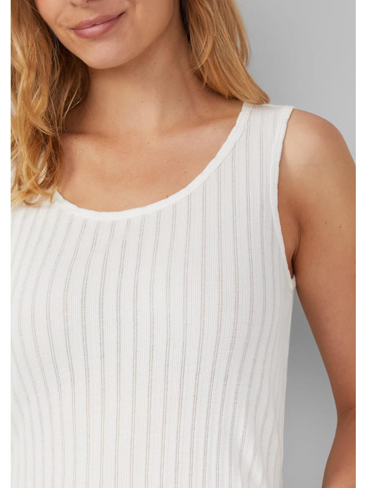 Этот мягкий облегающий трикотажный топ впечатляет изящной ажурной резинкой и классическим круглым вырезом. Полупрозрачная резинка делает эту базовую модель без рукавов вашим новым фаворитом для непринужденных повседневных образов.